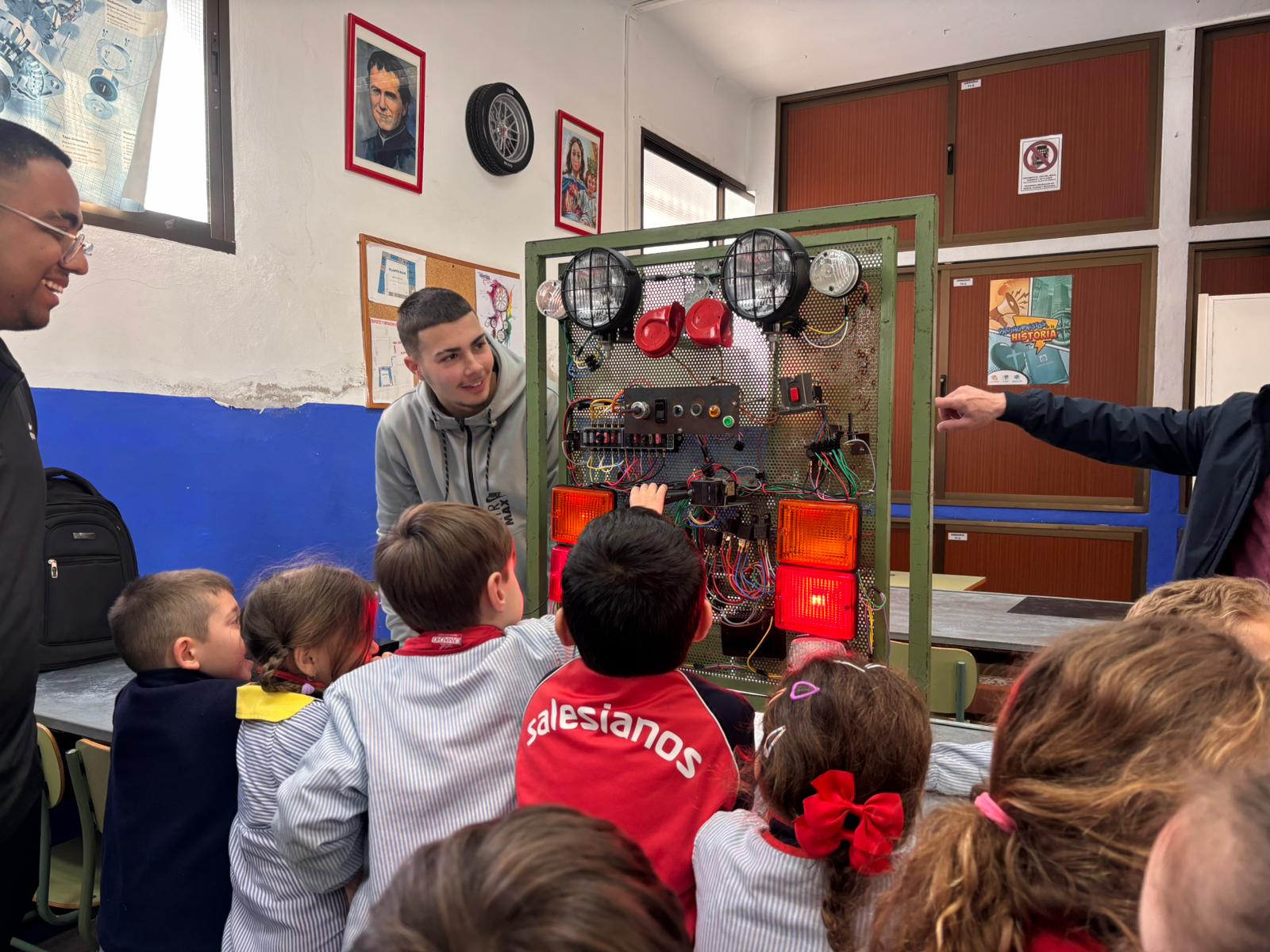 Nada más llegar, el profe Juan Carlos y sus alumnos nos dieron la bienvenida y nos enseñaron todo lo que están aprendiendo sobre la electricidad en los automóviles. Con mucha paciencia y entusiasmo, nos explicaron cómo funcionan algunas de las partes eléctricas de los coches y, lo mejor de todo… ¡nos dejaron probarlas!